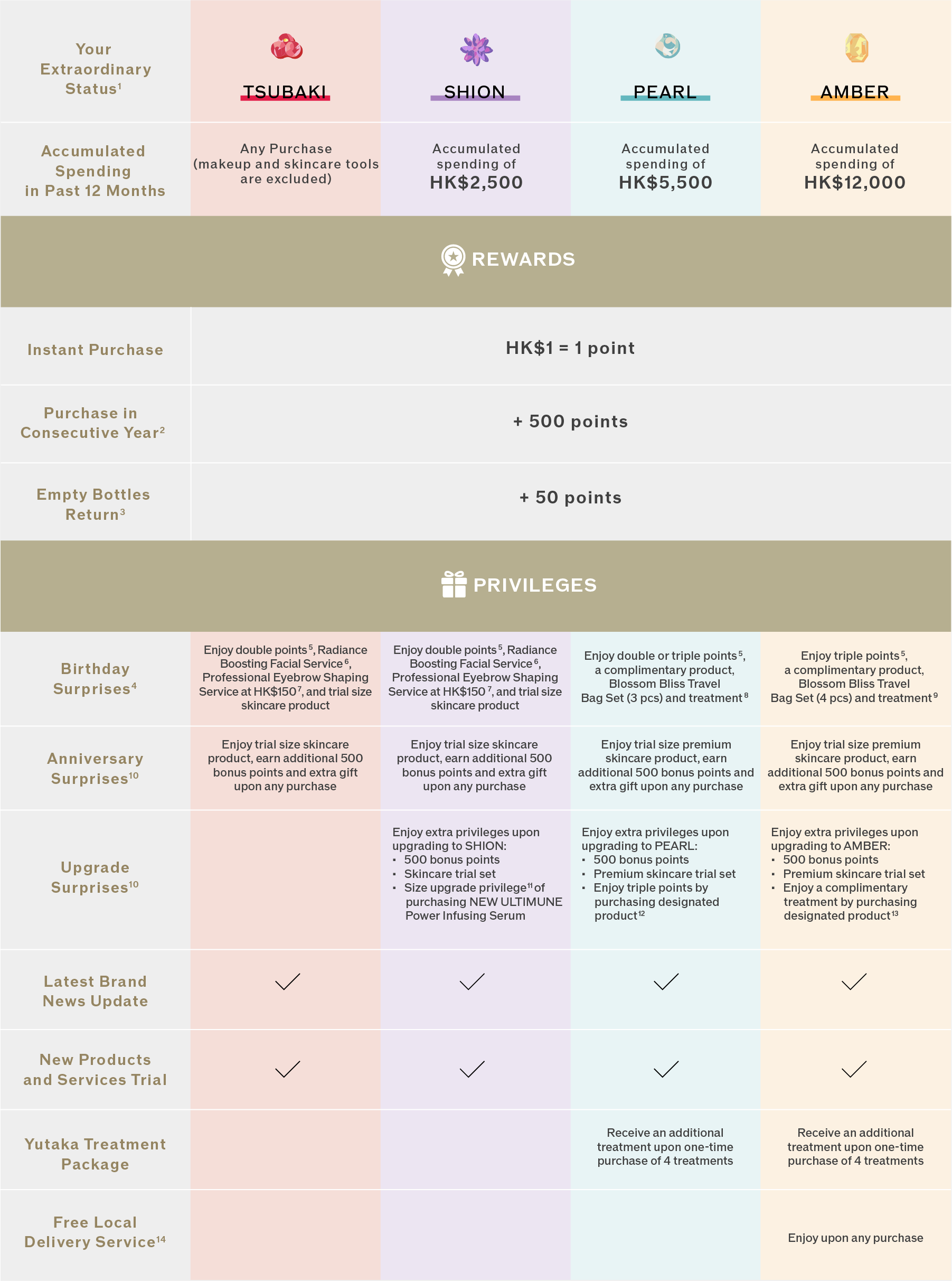 Inspired by nature, there are 4 tiers in Camellia Club: Tsubaki, Shion, Pearl, and Amber. Tsubaki and Shion are enchanting flowers commonly found in Japan while Pearl and Amber are unique and timeless gems emanated from nature. These signature icons illustrate the outer beauty and ignite your inner beauty with confidence, elegance and vitality.