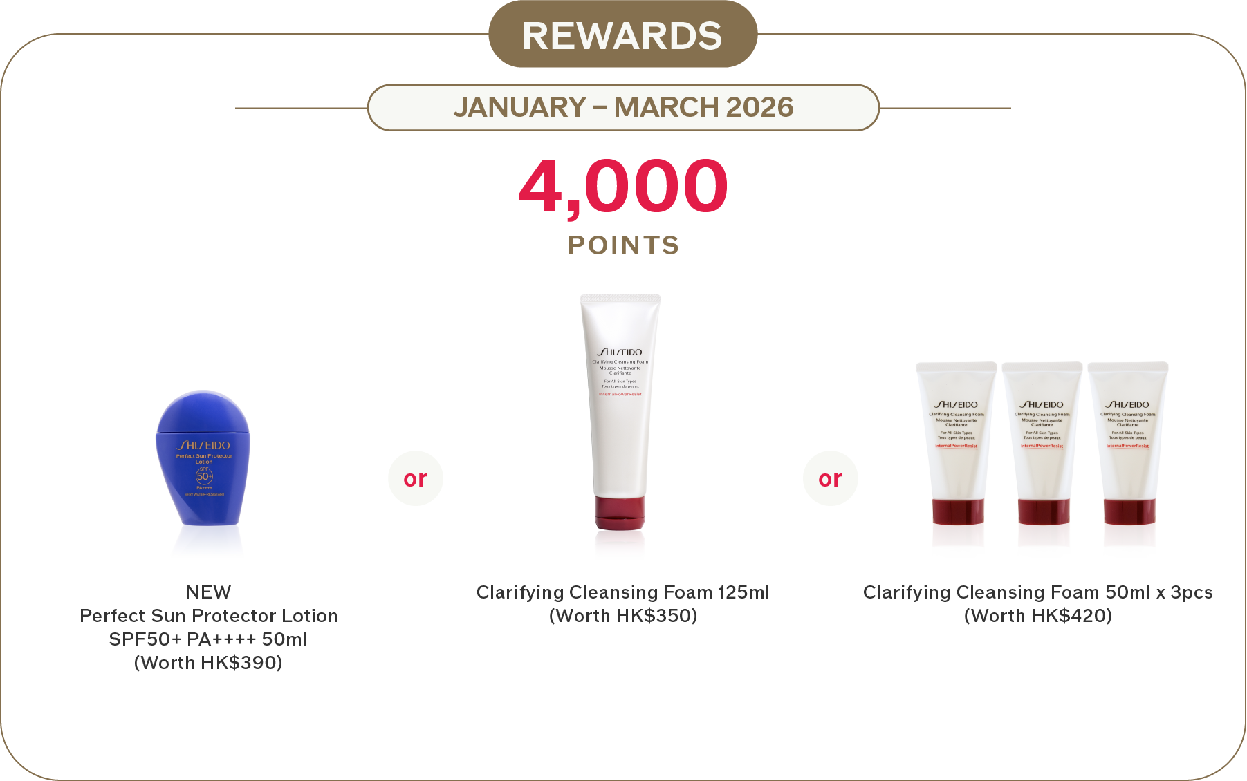 3.Enjoy 50 bonus points upon returning any empty SHISEIDO serum or cream bottle in SHISEIDO shops, counters or Beauty Zone.