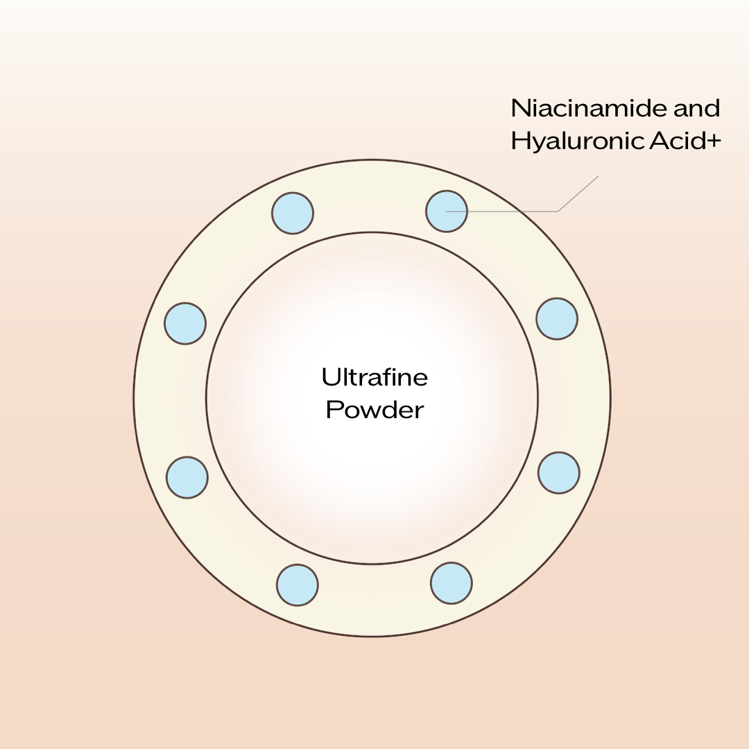 Ultrafine powder is coated with Niacinamide and Hyaluronic Acid+.