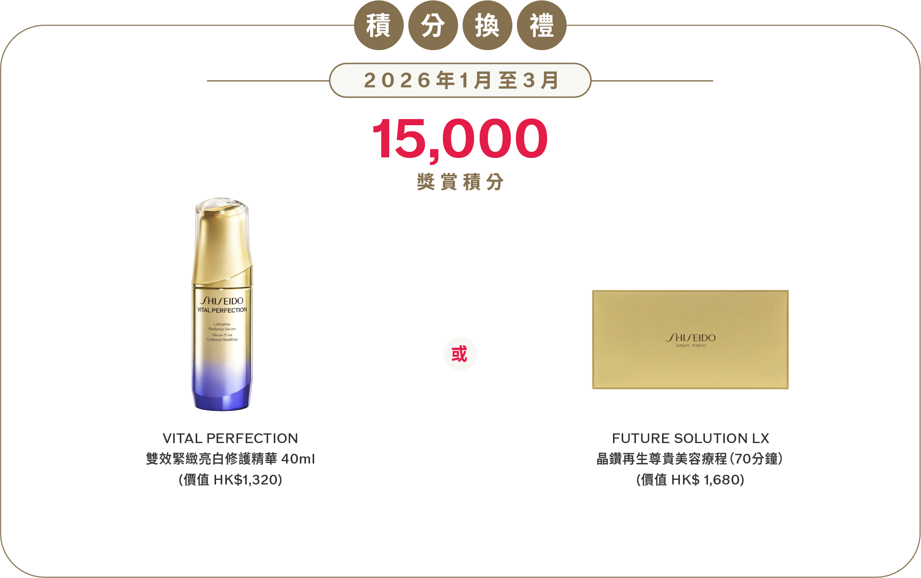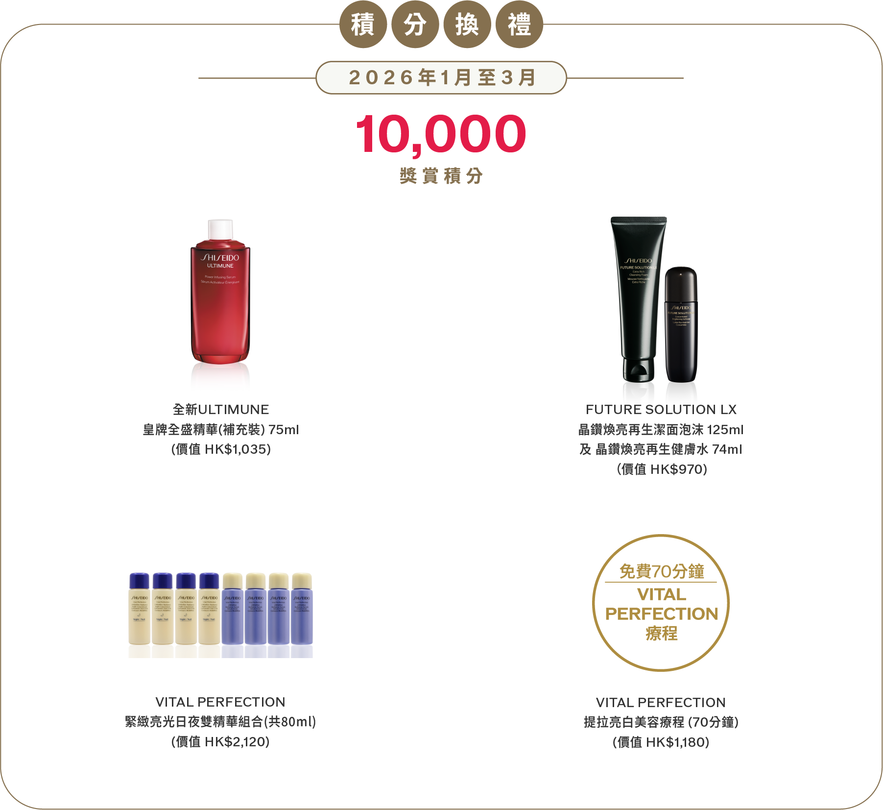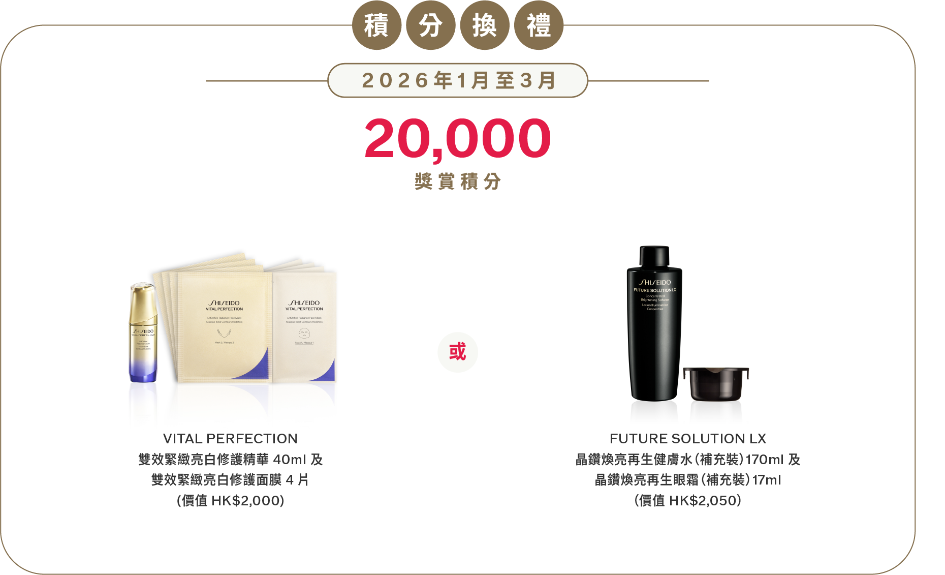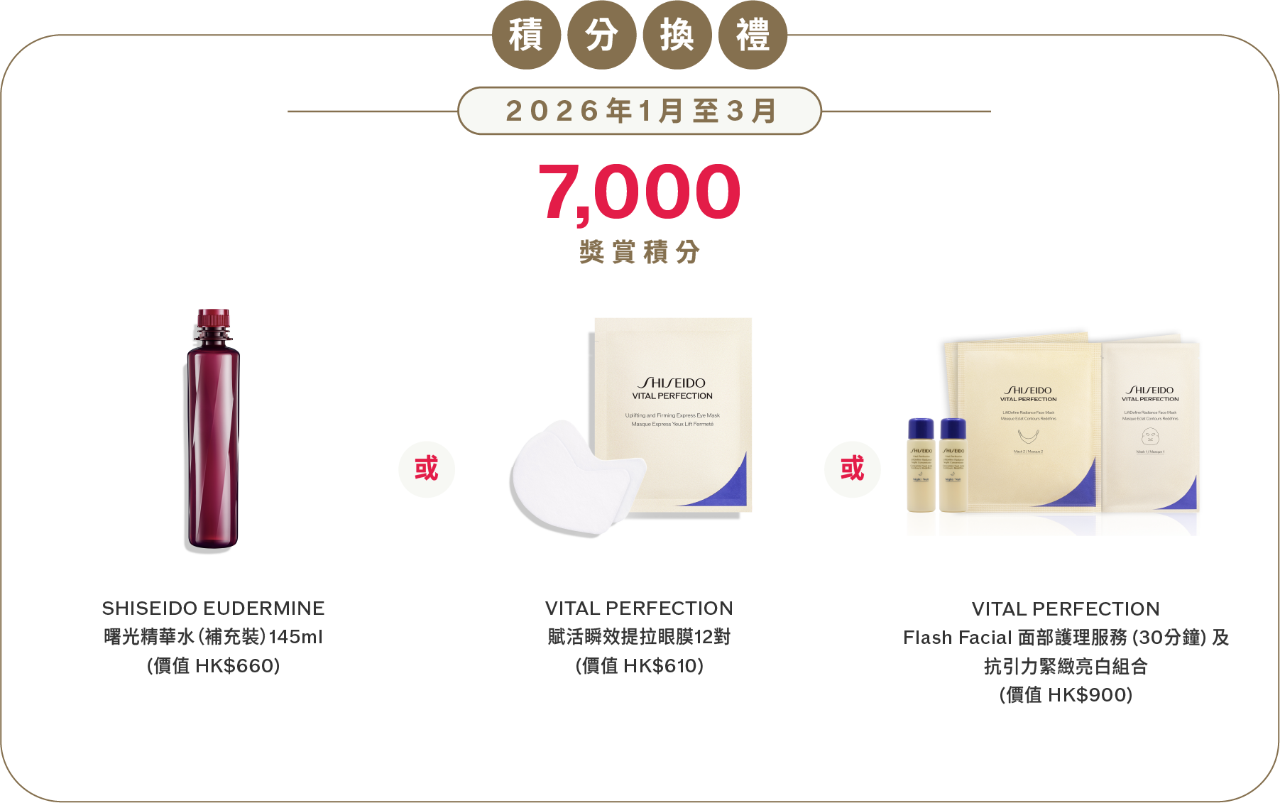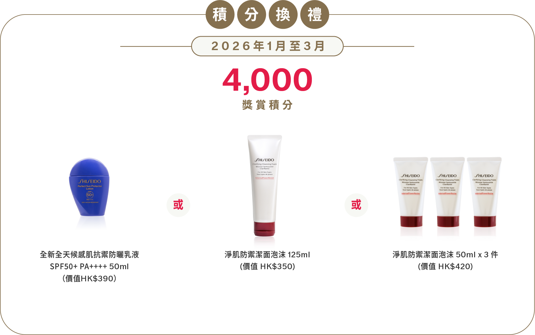 ‧積分換禮的禮品只限SHISEIDO登記會員本人於任何門市換領,並需出示身份證明文件如信用卡,以核對換領者身份。資生堂香港有限公司將保留核對會員身份證明文件之權利。